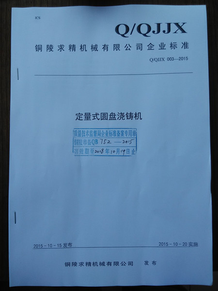 我公司制定的定量式圓盤澆鑄機企業(yè)標準已審核備案